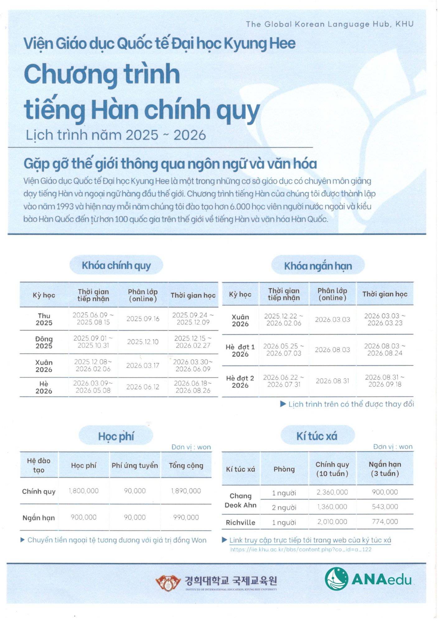 Viện Giáo dục Quốc tế Đại học Kyung Hee giới thiệu Chương trình tiếng Hàn 2025–2026 dành cho học viên quốc tế mong muốn làm chủ ngôn ngữ và trải nghiệm văn hóa Hàn Quốc trong môi trường học thuật chuẩn quốc tế. Với đội ngũ giảng viên tận tâm, cơ sở vật chất hiện đại và dịch vụ hỗ trợ toàn diện, Kyung Hee là điểm đến lý tưởng để bạn khởi đầu hành trình học tập tại “xứ kim chi”.