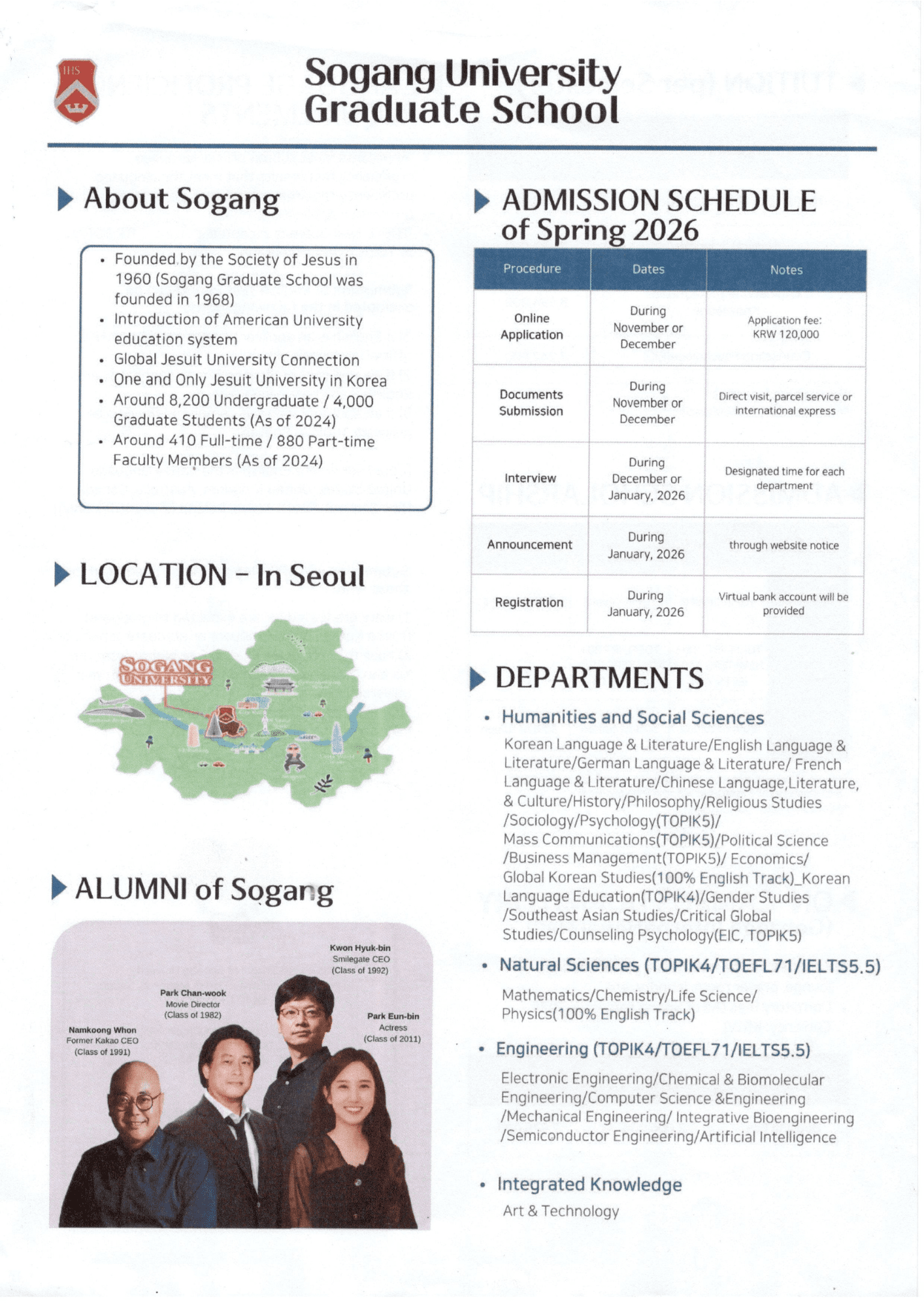 Sogang là lựa chọn lý tưởng cho các bạn sinh viên Việt Nam mong muốn theo học trong môi trường quốc tế ngay tại trung tâm thủ đô Seoul – nơi giao thoa giữa văn hóa, công nghệ và cơ hội phát triển toàn diện.