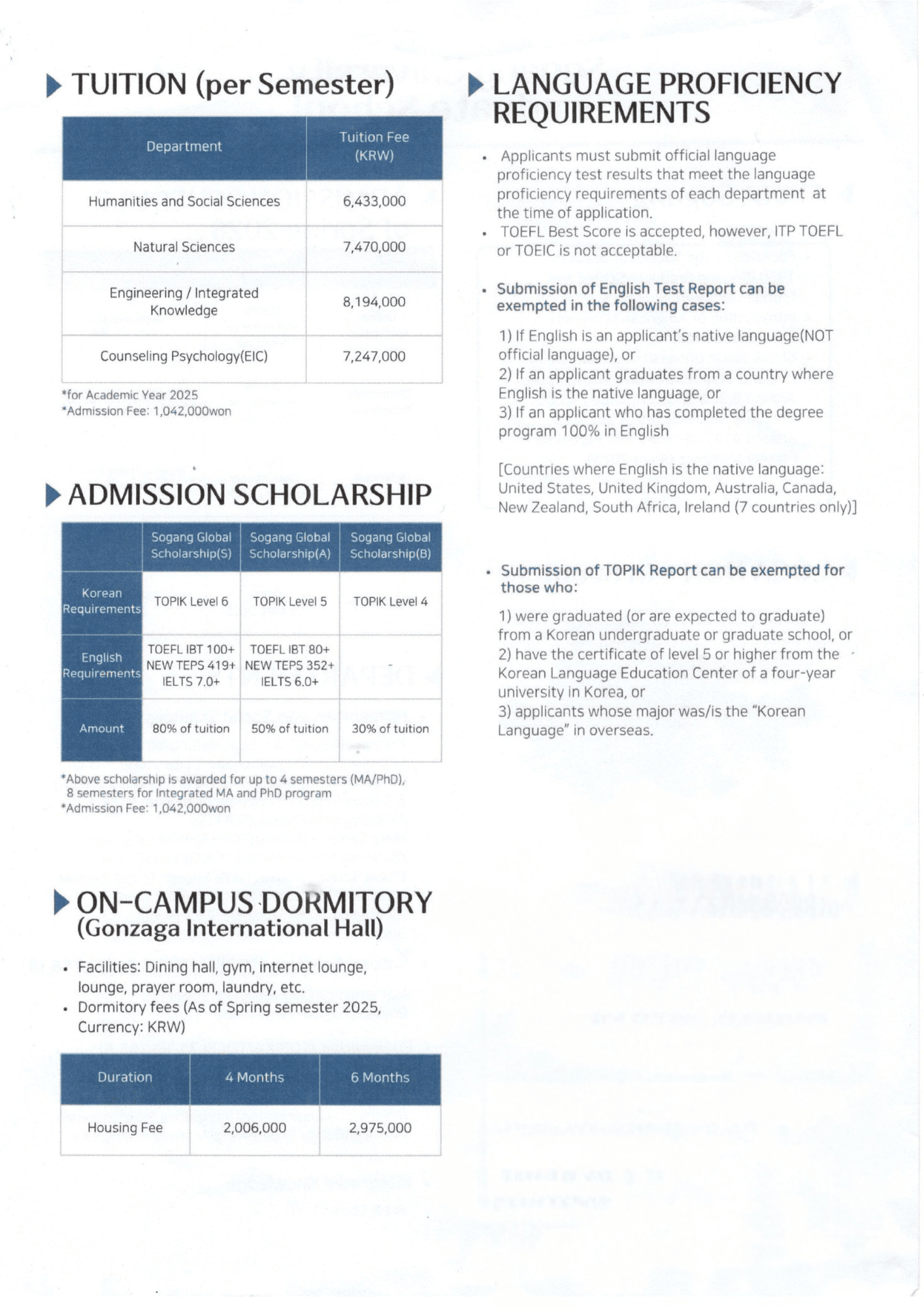 Học phí tại Sogang năm 2025 dao động từ 6.433.000 – 8.194.000 KRW/kỳ, tùy chuyên ngành. Ngành Tâm lý học Tư vấn có học phí riêng là 7.247.000 KRW/kỳ, kèm theo phí nhập học 1.042.000 KRW.