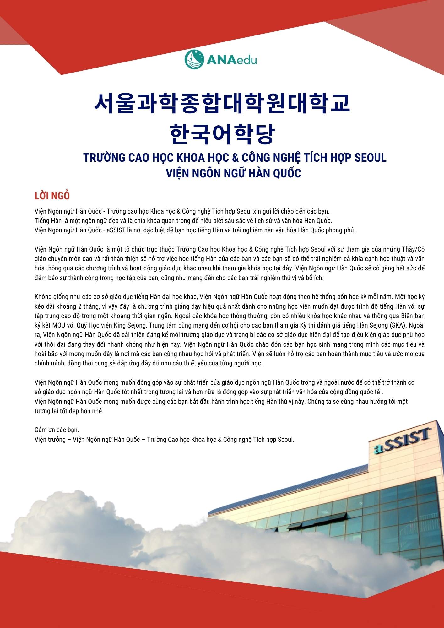Viện Ngôn ngữ Hàn Quốc – Trường Cao học Khoa học & Công nghệ Tích hợp Seoul (aSSIST) là điểm đến lý tưởng cho những ai mong muốn theo học tiếng Hàn trong môi trường chuyên nghiệp, hiện đại, ngay giữa lòng thủ đô Seoul.