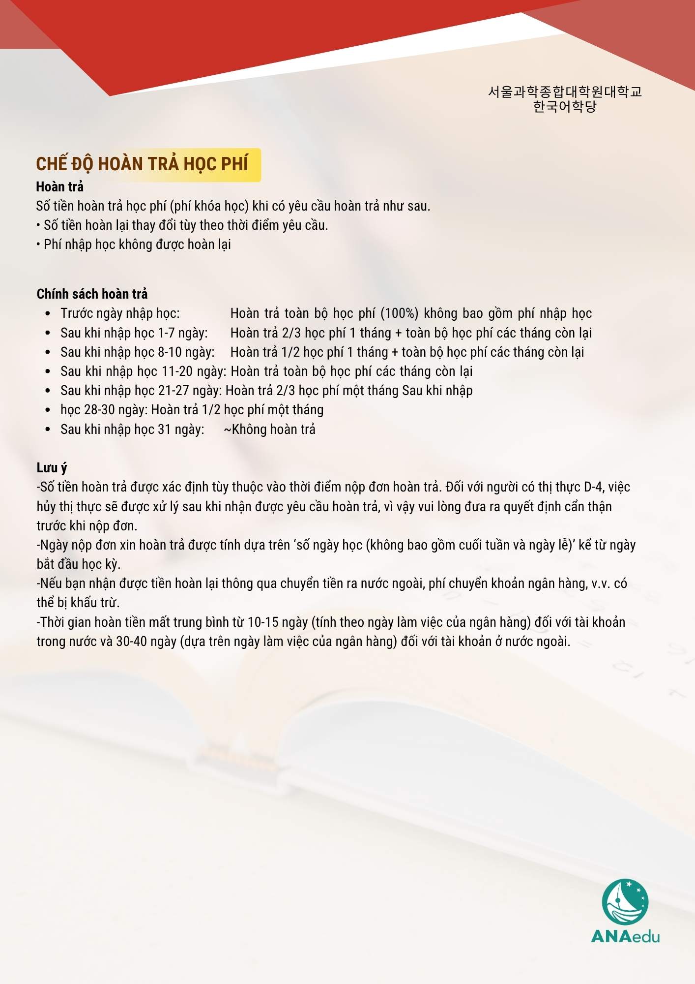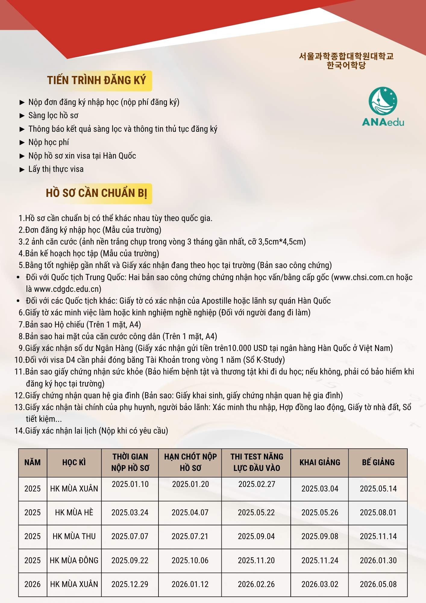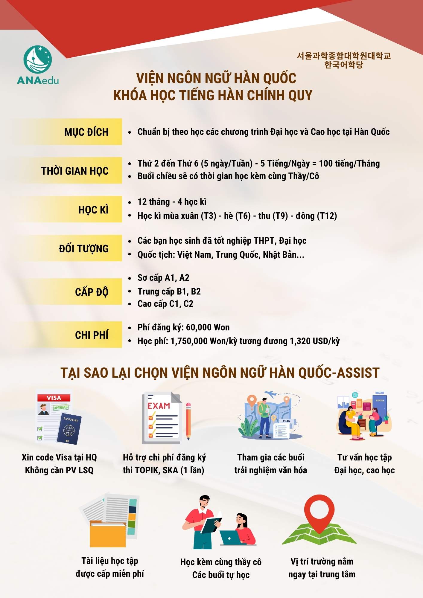 Với hệ thống đào tạo 4 kỳ mỗi năm, chương trình học tại Viện được thiết kế dành riêng cho sinh viên quốc tế mong muốn đạt được trình độ tiếng Hàn nhanh chóng, phục vụ cho mục tiêu du học đại học hoặc cao học tại Hàn Quốc.