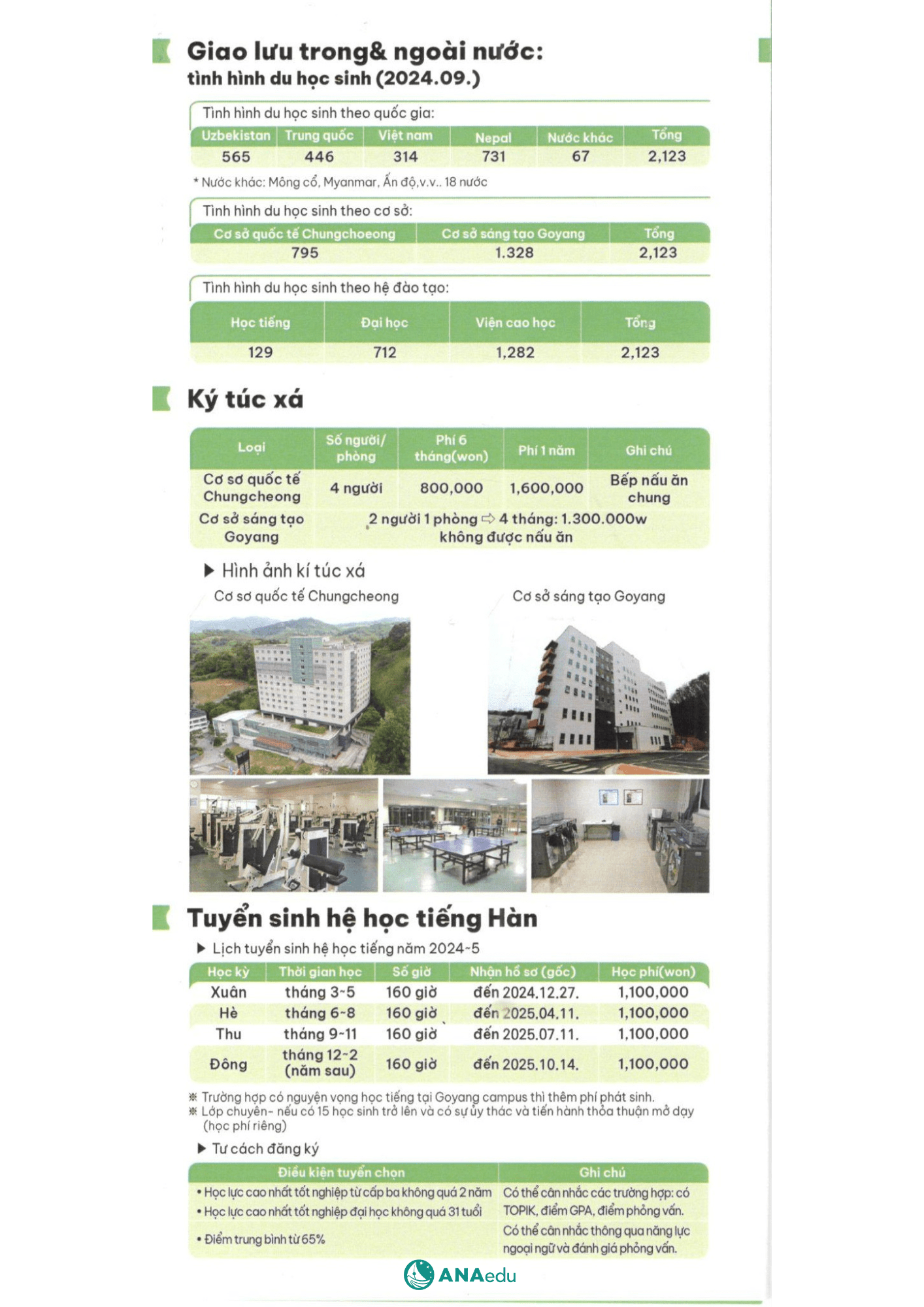 Ký túc xá tại hai cơ sở Chungcheong và Goyang đều được trang bị tiện nghi hiện đại, bao gồm phòng học, phòng gym, nhà ăn và khu giặt sấy. Mức phí chỉ từ 800.000 KRW/6 tháng, tiết kiệm hơn nhiều so với mặt bằng chung tại Hàn Quốc.