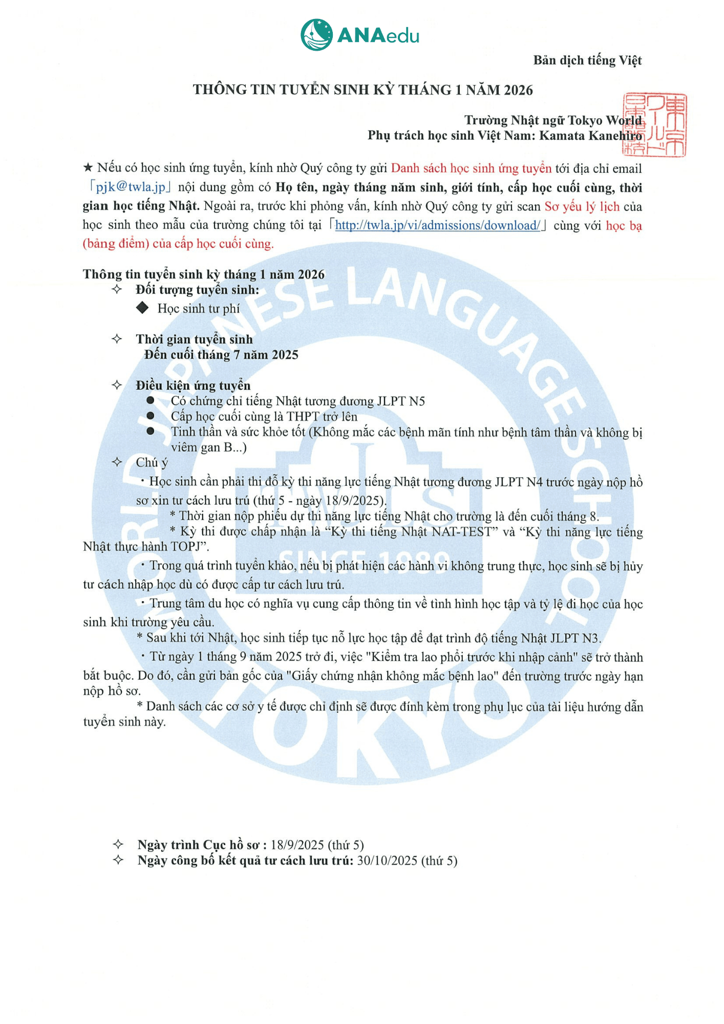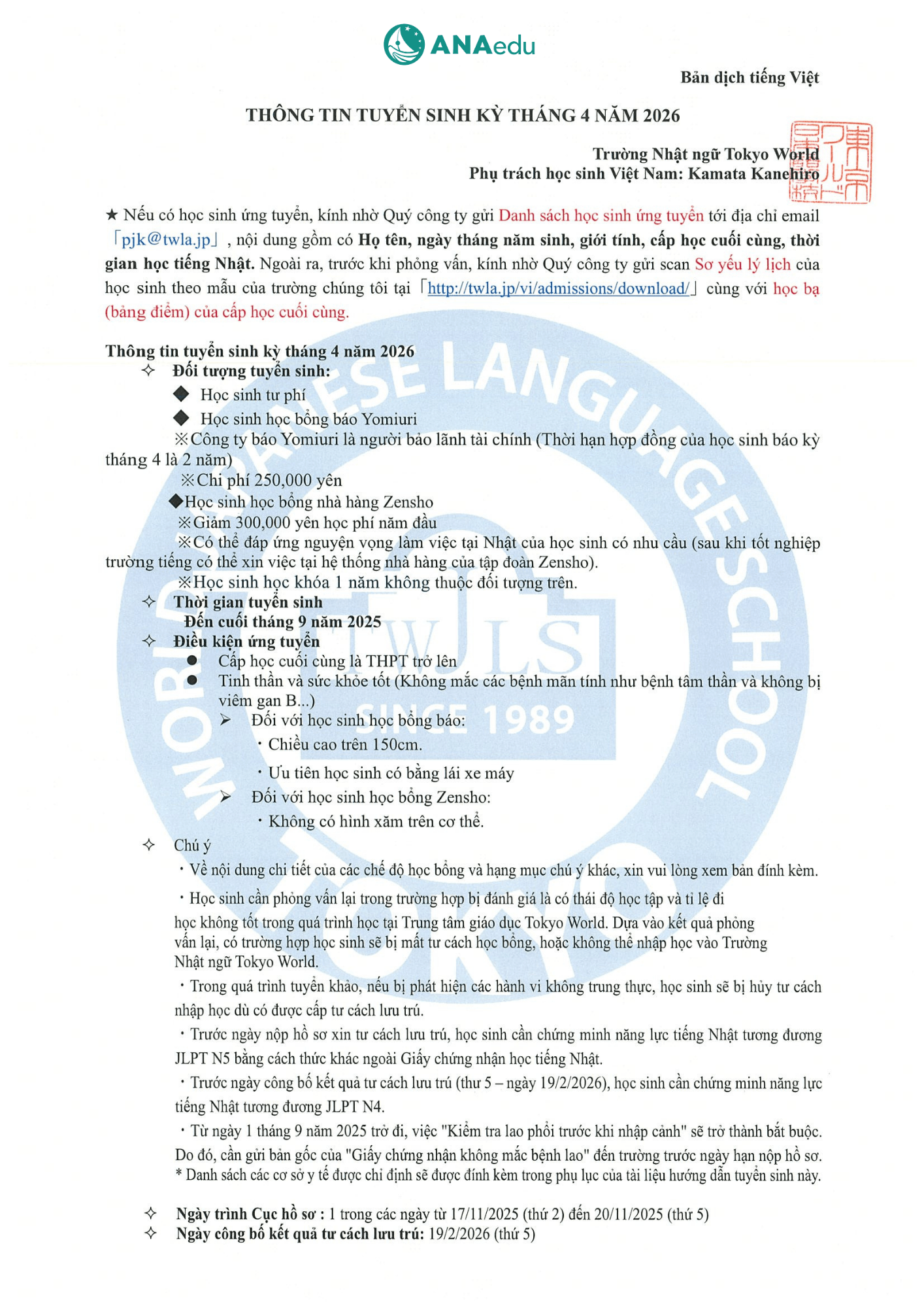 Với gần 40 năm kinh nghiệm, cơ sở vật chất hiện đại, đội ngũ giảng viên chuyên môn cao và dịch vụ hỗ trợ học viên toàn diện, Trường Nhật ngữ Tokyo World chính là điểm đến lý tưởng cho những ai đang tìm kiếm con đường du học Nhật Bản bền vững, hiệu quả và nhiều cơ hội.